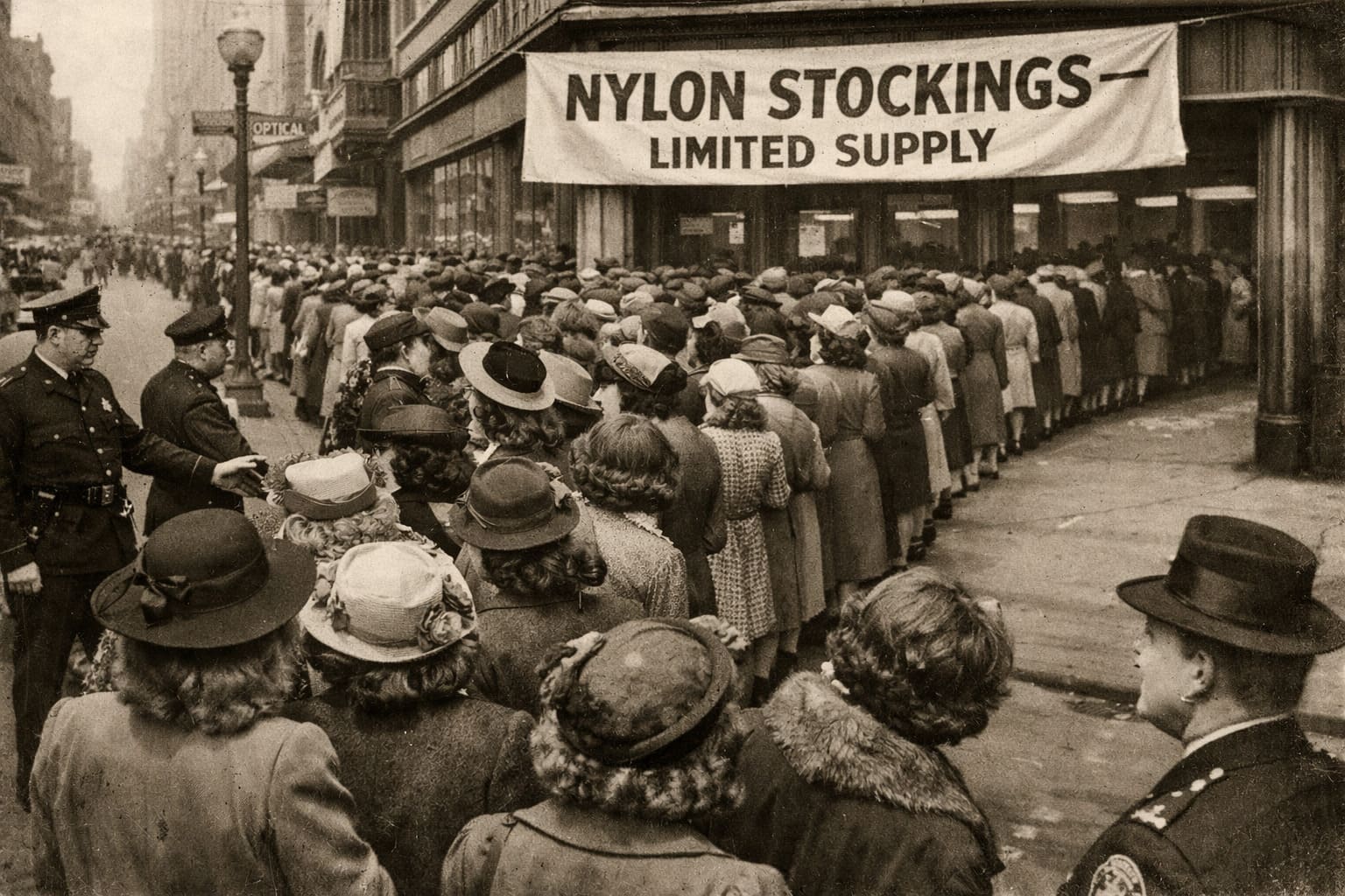 40,000 people stormed a Pittsburgh store for 13,000 pairs of stockings. A San Francisco store window was smashed. Underwear literally caused civil unrest.